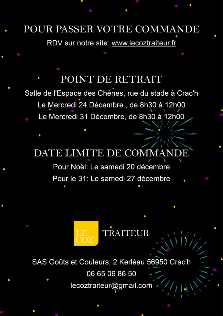 Comme l’annĂ©e dernière, nous vous donnons RDV Ă la salle de l’Espace des ChĂŞnes, rue du stade Ă Crac’h(56950) pour retirer vos commandes.